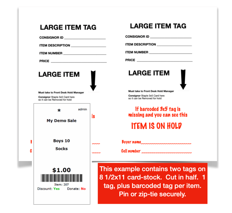 1. Use CARD-STOCK to print tags and medium size safety pins (no straight pins or small gold safety pins). Tagging guns also work well to attach tags. Use packing tape to secure tag.
